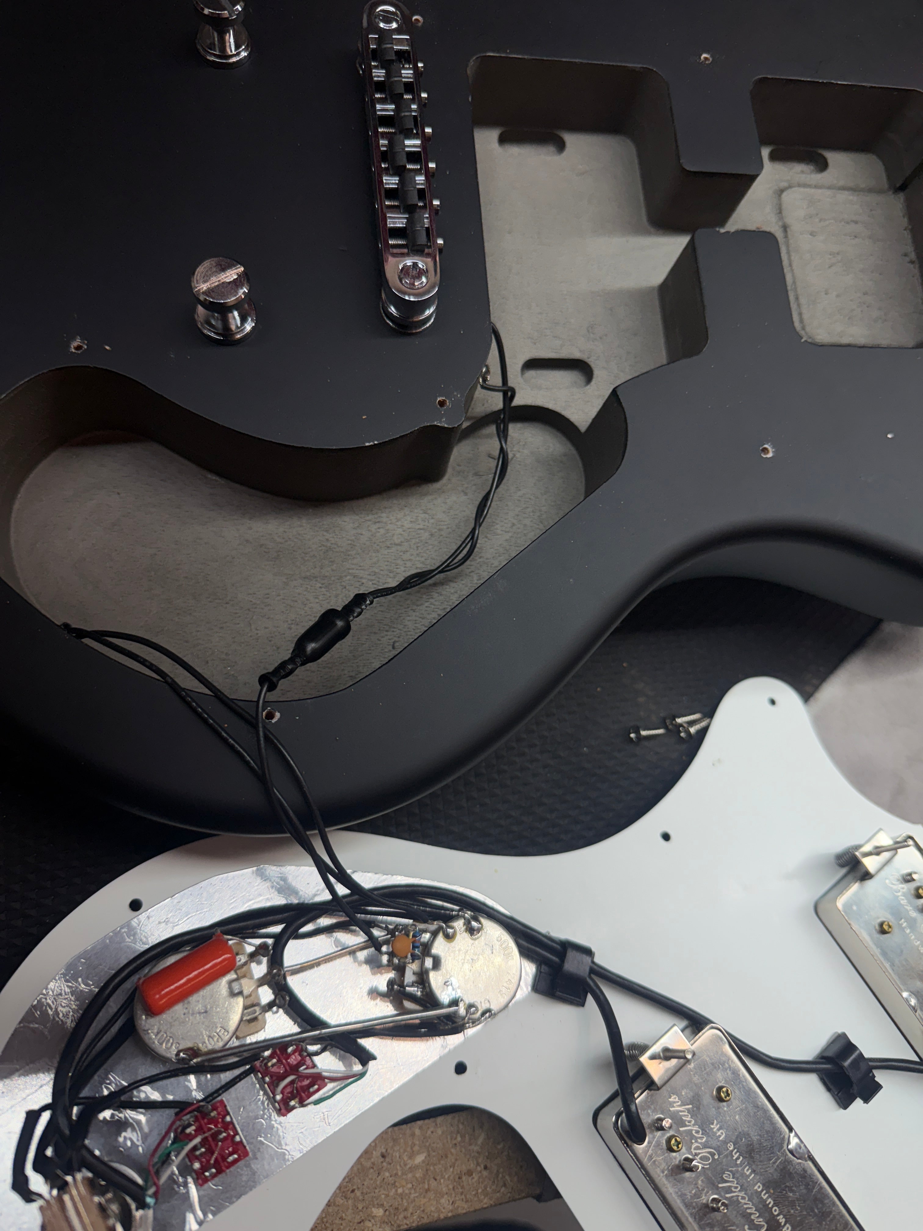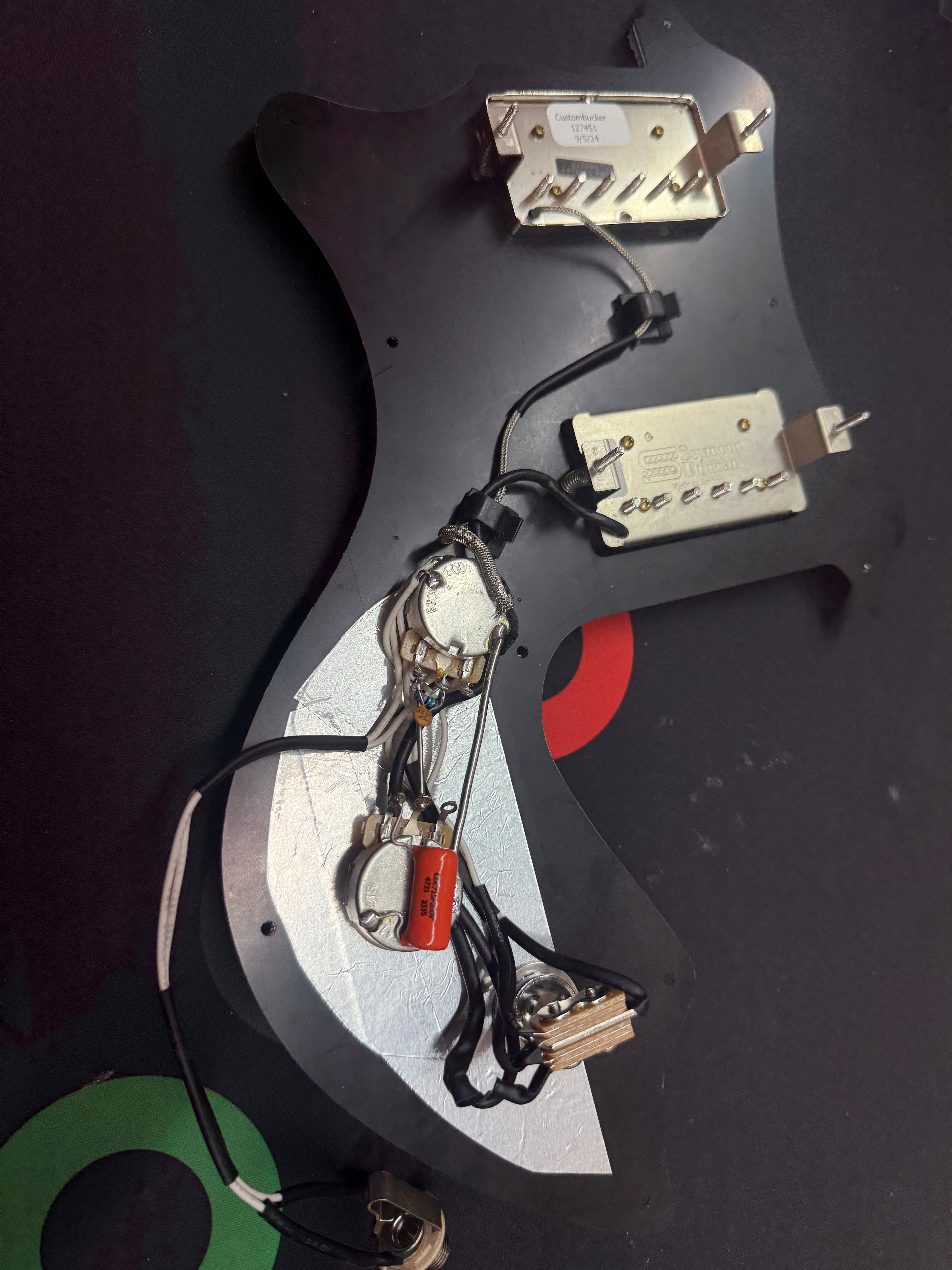 We use the highest quality parts available for our builds. Durability is our number one priority so we add heat shrink on all contacts that could touch others and cause drop outs, and reinforcing bars to stop the volume and tone pots from turning on each other and snapping cables if they come loose while playing.